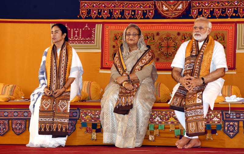 ( Prime Minister Sheikh Hasina along with Indian Prime Minister Narendra Modi and Chief Minister of West Bengal Mamata Benarjee at at Vivsa-Bharati University in Santiniketan on Friday.)