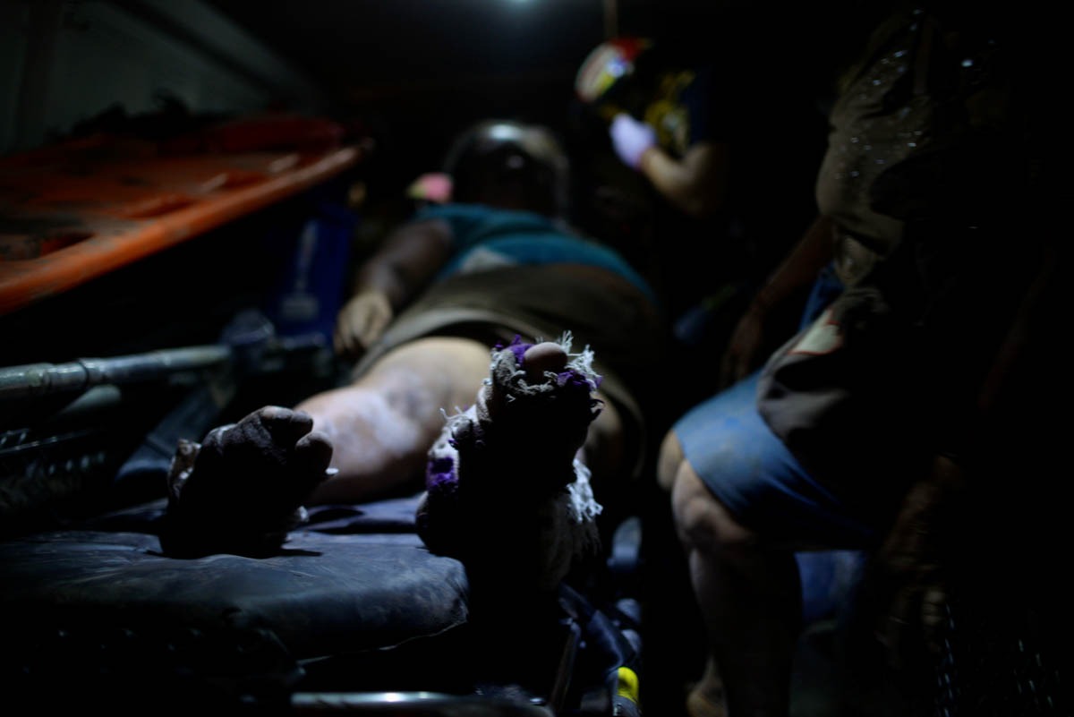 A woman covered with ash and burn wounds on her legs is taken to hospital after Fuego volcano erupted violently, in El Rodeo, Guatemala June 3, 2018. REUTERS/Fabricio Alonzo – RC1FE3854670