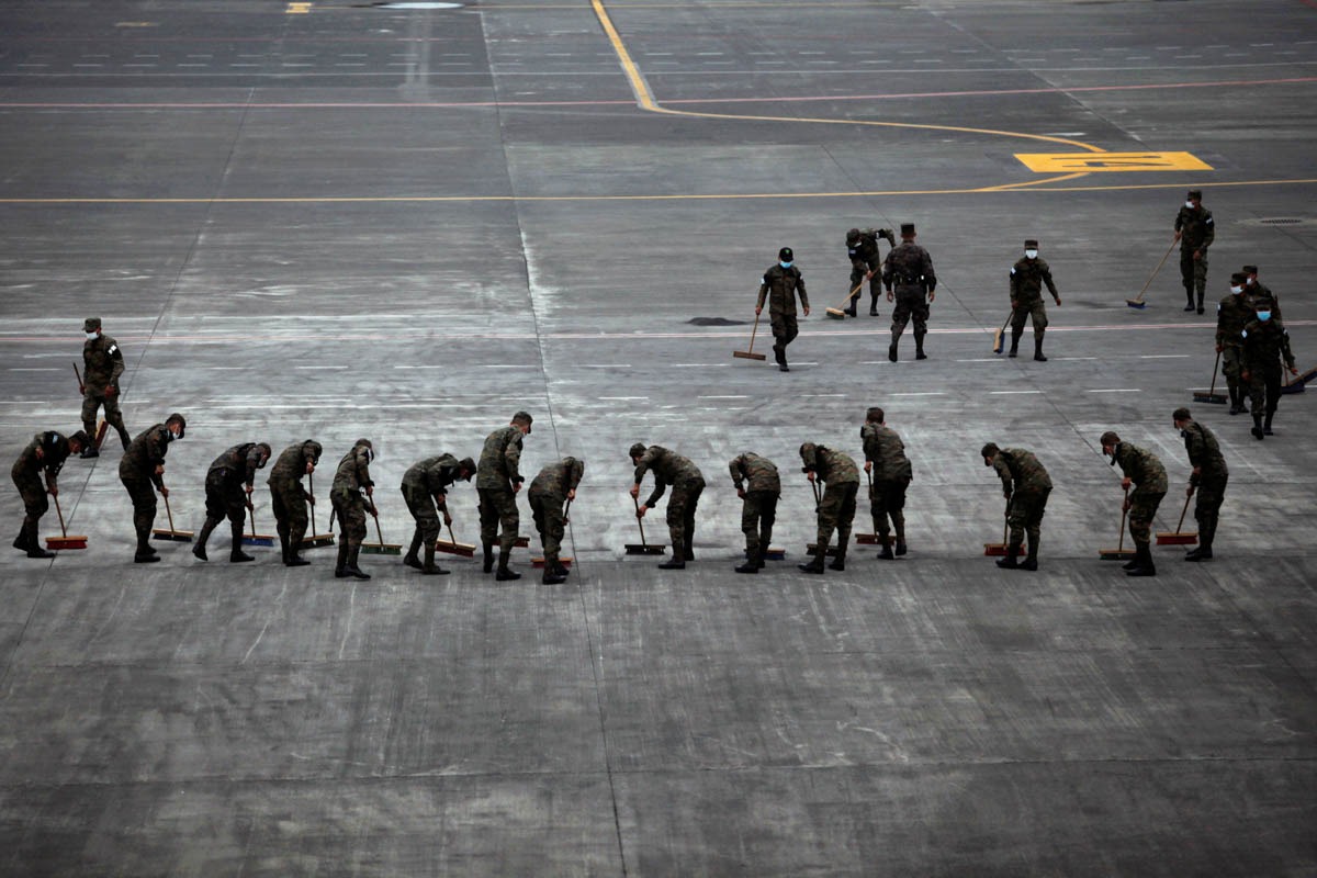 Soldiers sweep the ash covered tarmac at La Aurora International Airport after Fuego volcano erupted violently, in Guatemala City, Guatemala June 3, 2018. REUTERS/Luis Vargas TPX IMAGES OF THE DAY – RC134A02A670